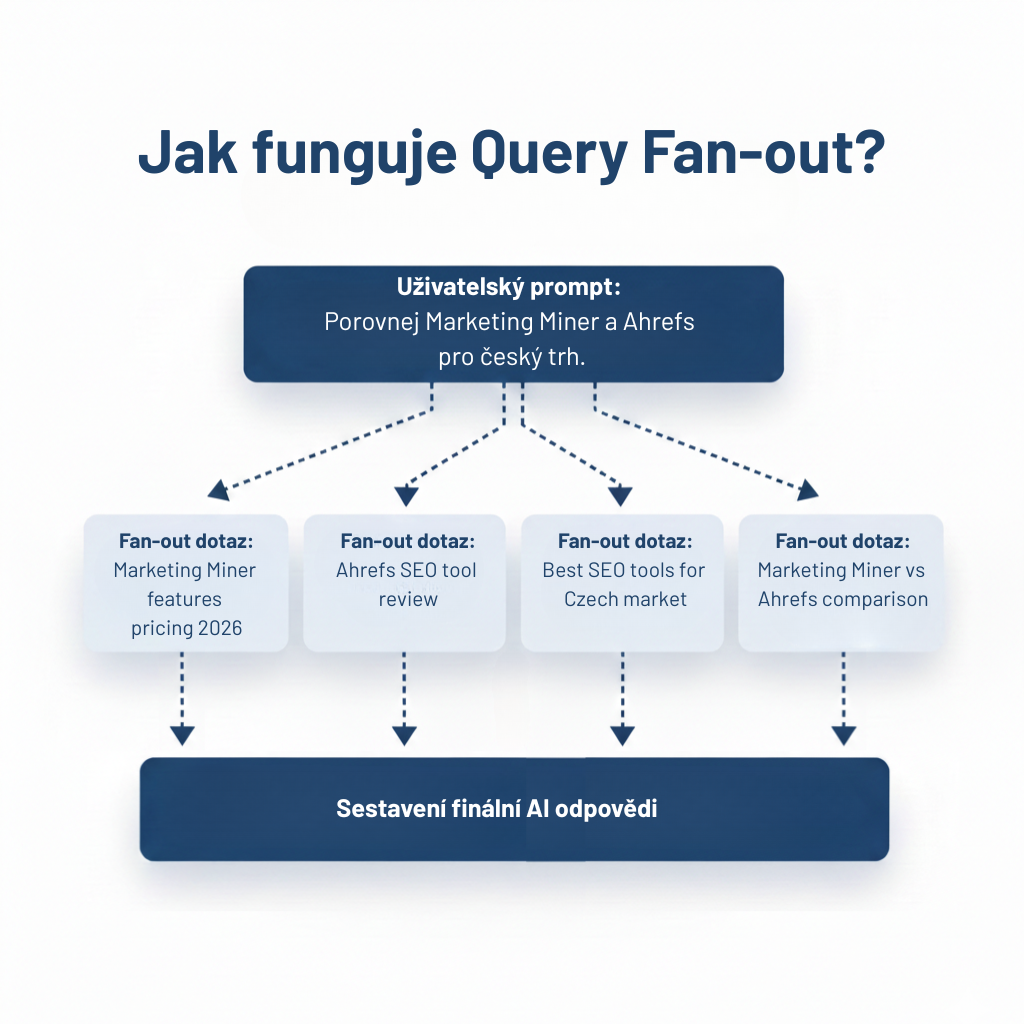 Představte si, že zadáte prompt: „Porovnej Marketing Miner a Ahrefs pro český trh.“ ChatGPT vyhodnotí, že pro relevantní srovnání v reálném čase potřebuje aktuální data z webu. Na pozadí tedy do vyhledávače odešle sérii specifických fan-out dotazů: