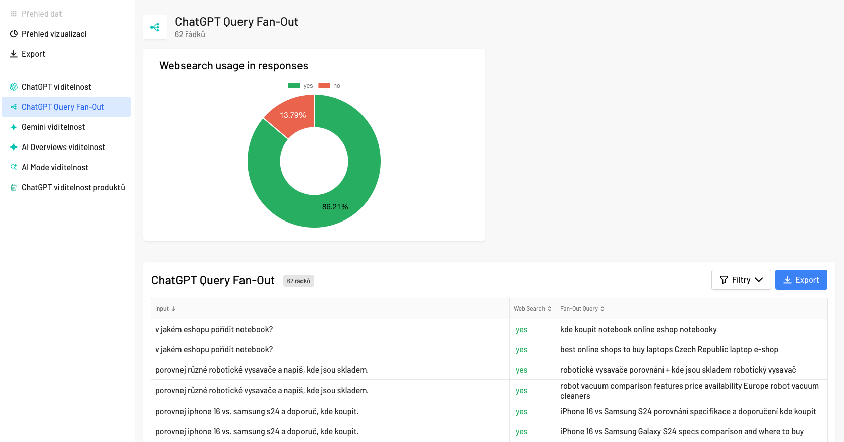 Právě výsledky těchto dílčích hledání určují, koho ChatGPT ve finále ocituje nebo doporučí. Pokud tyto „neviditelné“ dotazy neznáte, vaše obsahová strategie se opírá o pouhé dohady. Analýza Query Fan-out vám dává do rukou přesná data o tom, co AI skutečně hledá, a umožňuje vám připravit obsah, který na tyto otázky odpoví nejlépe.