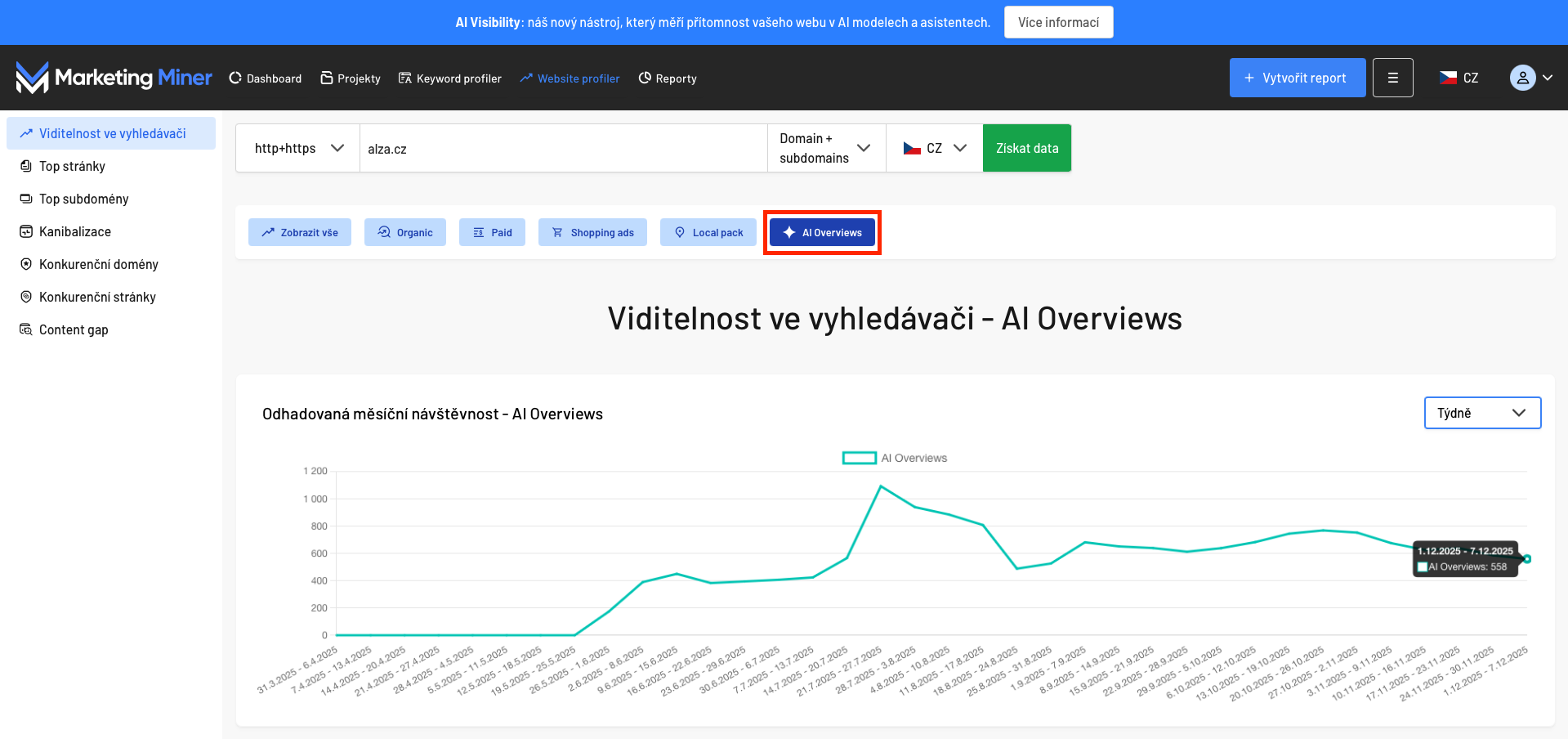Do Website Profileru jsme doplnili data z Google AI Overviews (AI odpovědí ve vyhledávání). Díky tomu máte možnost měřit u konkurenčních domén také jejich AI viditelnost, nejen organickou nebo placenou. Po zadání libovolné domény nebo URL nově uvidíte: