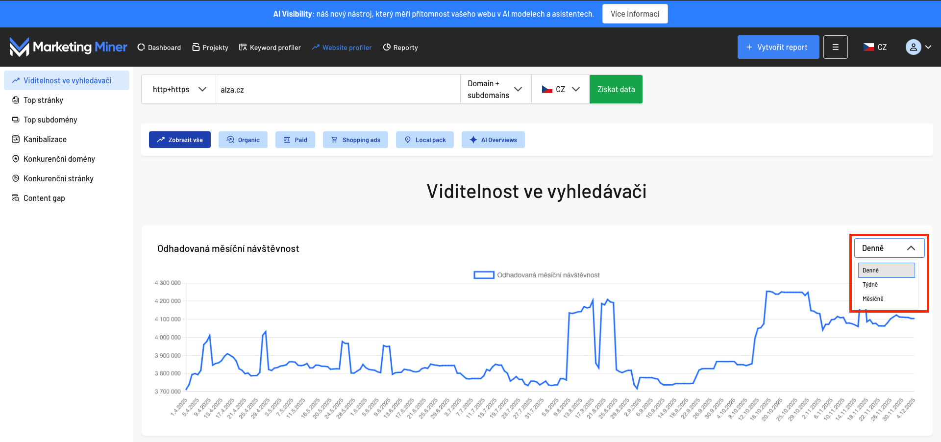 Pro ještě přesnější analýzu vývoje viditelnosti ve vyhledávači jsme rozšířili graf o možnost přepínat mezi denním, týdenním a měsíčním zobrazením. Tato flexibilita vám umožní pracovat s daty přesně tak, jak potřebujete a snadněji odhalit sezónnost, propady nebo růst viditelnosti analyzované domény nebo URL.