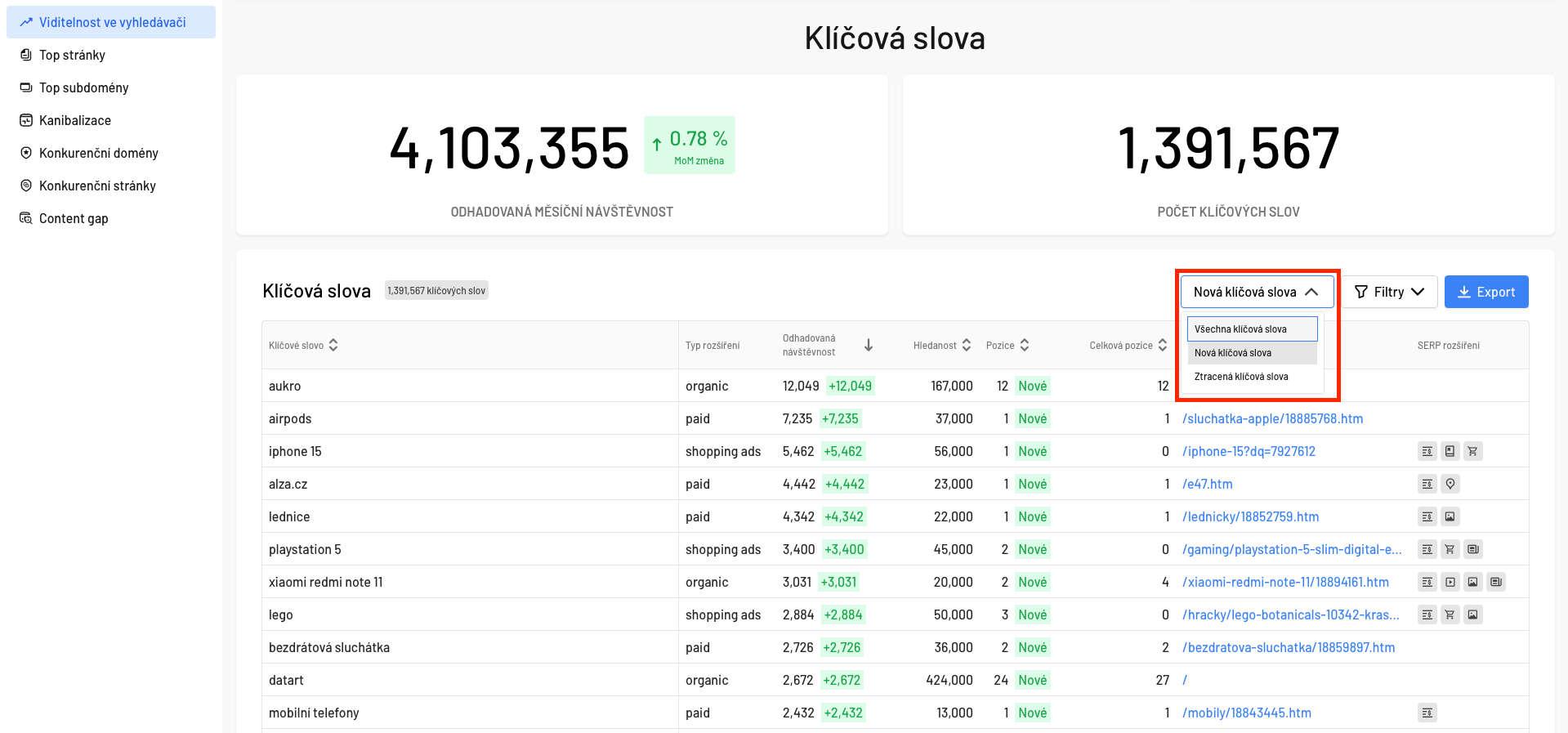 Díky tomu během pár vteřin zjistíte, kde konkurence získává nové pozice nebo kde ztratila viditelnost.