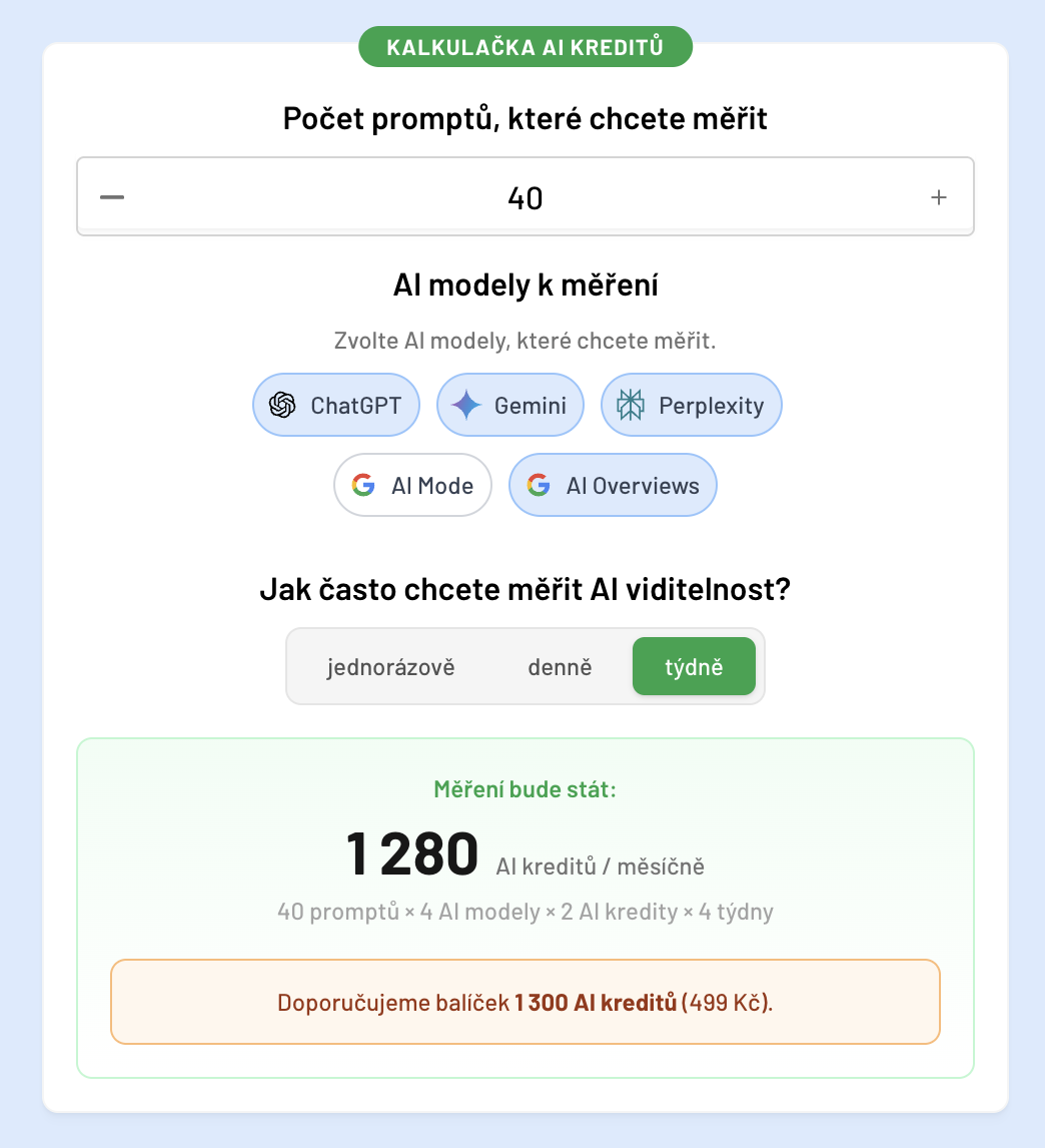 - Kalkulačka pro výběr AI tarifu - na stránce k AI viditelnosti jsme přidali interaktivní kalkulačku. Stačí zadat počet promptů, zvolené AI modely a frekvenci měření (jednorázově, denně či týdně) a nástroj vám spočítá náklady a doporučí ideální tarif pro vaše projekty.