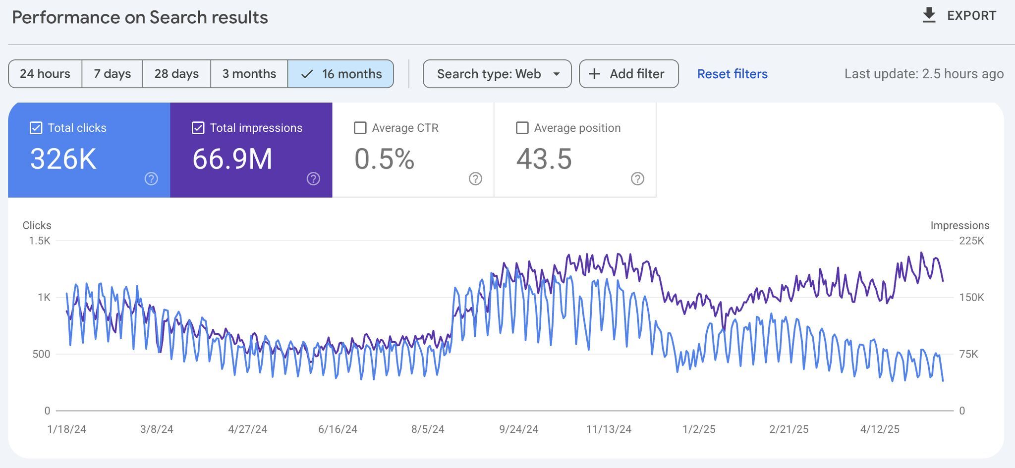 Tuto anomálii podrobně zmapovaly i zahraniční zdroje. Search Engine Journal ve svém článku potvrzuje, že týmy, které v posledním roce reportovaly metriky založené na zobrazeních, pracovaly s nadhodnocenými čísly. Search Engine Roundtable k tomu dodává, že tato chyba v logování vytvořila v grafech GSC tzv. „aligátora“ - vizuální rozevírání nůžek, kdy imprese raketově rostly, zatímco kliknutí zůstávala stabilní. Právě kvůli těmto uměle vysokým impresím se pak vypočítané CTR v reportech jevilo jako mnohem nižší, než byla skutečnost.