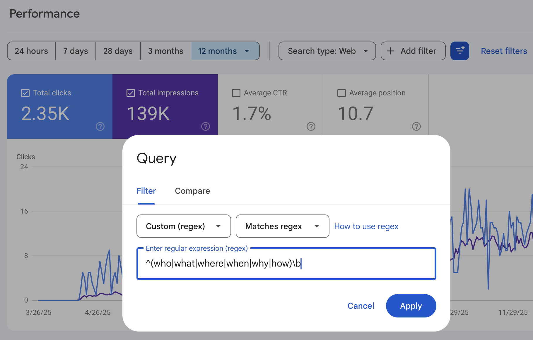 Filtering for questions in Google Search Console using Regex