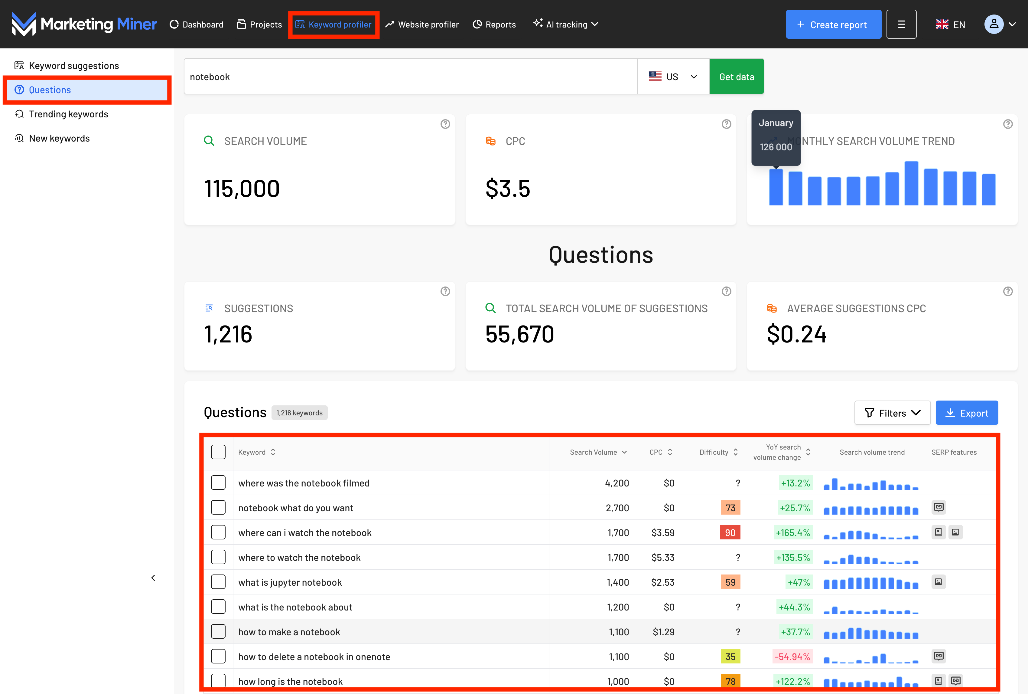 You can also get inspiration directly in Marketing Miner using the Keyword Profiler tool. Simply enter a keyword, and in the Questions tab, you’ll immediately see what people are most frequently asking about the topic. These are ideal because you can see the real search volume for each question, ensuring you track topics that users actually care about.