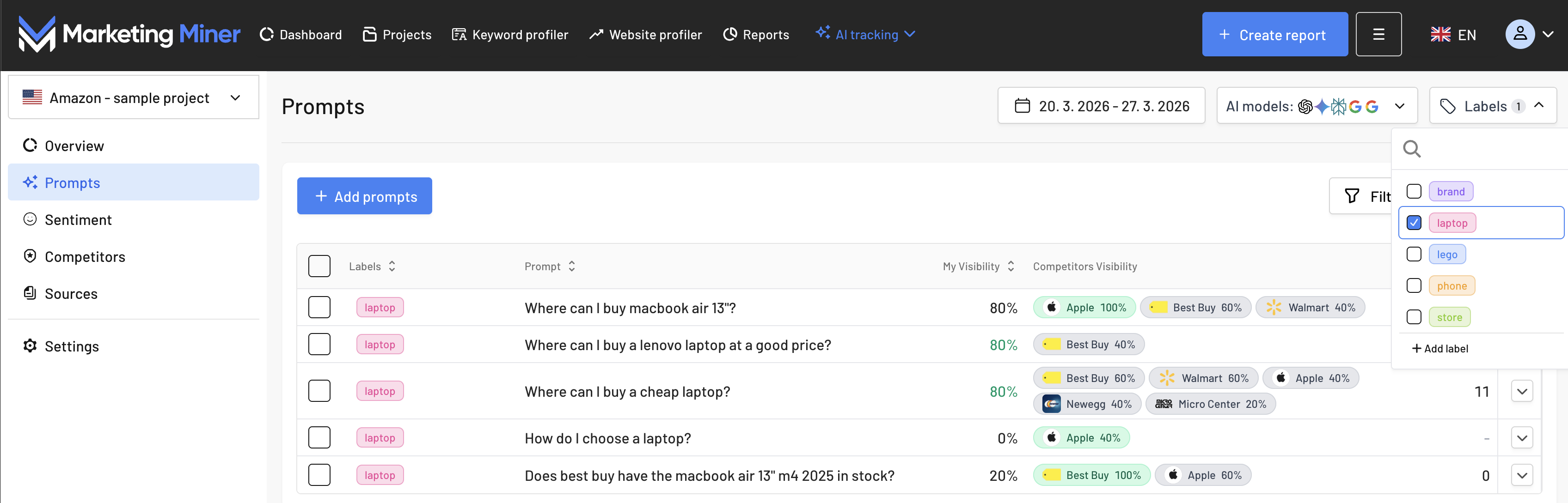 To make evaluating entire topics as easy as possible, you can easily group your prompts using labels in Marketing Miner. This gives you a clear overview of how your brand performs in a specific product category or at a certain stage of the buyer’s journey.