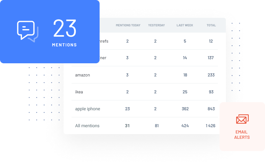 Figyeld a márka említéseit, a versenytársakat és az iparági frissítéseket. Értesülj minden egyes említésről, hogy azokat linkekké alakíthasd, és új partnerségeket építhess ki.