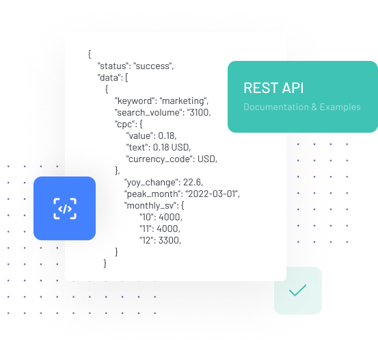 Nagymértékű és sokoldalú REST API-nk programozott hozzáférést biztosít a Marketing Miner adataihoz a saját eszközeidben. Több mint 10 végpont áll rendelkezésre az olyan adatok kinyeréséhez, mint a kulcsszó javaslatok, keresési mennyiség, weboldal forgalma és sok más.